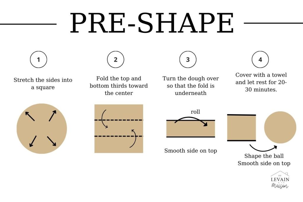 Pre-shape: gently spread the dough with your fingers to form a square. Pull the top third of the dough and fold it over the middle third. Then pull the bottom third and fold it over the middle. Then turn the dough so that the fold is underneath (in contact with the work surface) and the smooth side is on top (facing you). Cover with a towel and let rest for 20-30 minutes.