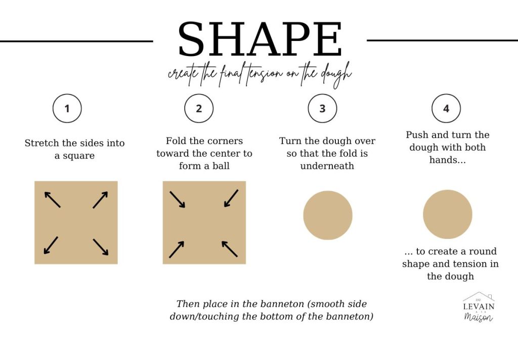 Forme : on crée la tension finale sur le pâte. Etirer la pâte en carré puis replier les quatre coins au centre. Retourner le pli sur le plan de travail puis pousser et tourner la pâte avec les deux mains pour créer une forme ronde et de la tension dans la pâte (voir recette en image). S’arrêter avant que la pâte ne casse, on veut une surface lisse mais pas appliquer trop de pression au point où la pâte craque. Vous pouvez vous aider d’un racloir à pâte pour pousser votre pâte et créer de la tension ou tout simplement la décoller du plan de travail délicatement.