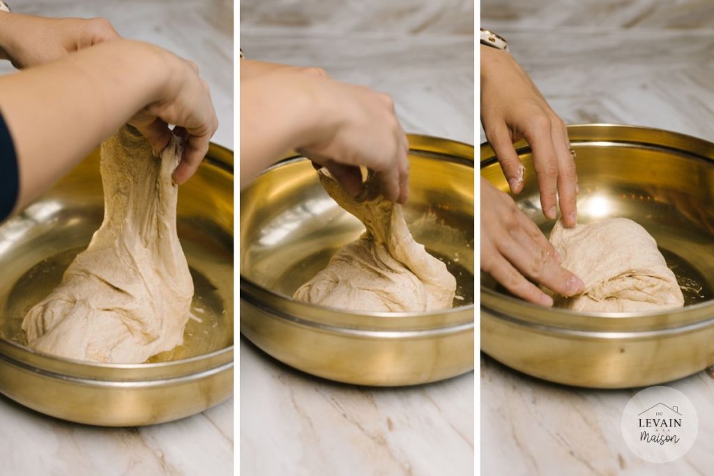 Lorsque vous faites un pétrissage « tire et plie » : placer votre pâte sur le plan de travail, imaginez 4 côtés. Vous allez tirer la pâte d’un côté et la replier sur la boule. Vous faites cela des 4 côtés de la pâte. Cela n’a pas besoin d’être parfait. Une fois que vous avez tiré et replié la pâte des 4 côtés, cela constitue un (cycle de) « tire et plie ». Vous allez faire cela, puis laisser reposer 30 minutes et recommencer. Pour faire ces 4 plis, un total de 4 fois. Vous allez remarquer un grand changement sur l’aspect et la flexibilité de la pâte.
