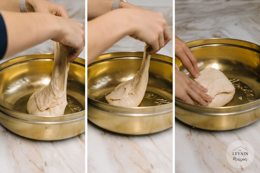 • Réaliser un pétrissage "stretch and fold" (tire et plie) : 4 fois avec 30 minutes de repos entre chaque pétrissage pour un total de 2 heures.